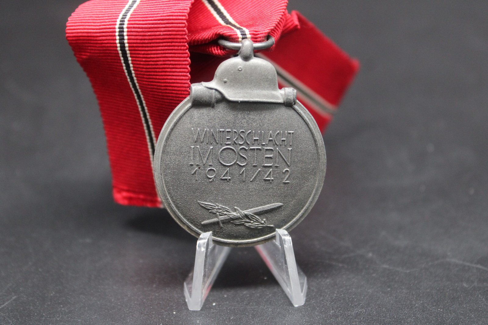 Original Winterschlacht im Osten 1941/42 (also known as the ‘Ostmedaille’ and Winter War Medal). Maker marked with “13” for Gustav Brehmer, Markneukirchen. Medal complete with ribbon. Zink. Condition as seen.