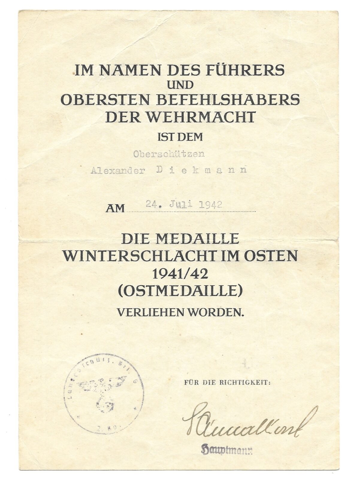 Award document of Oberschütze Adolf Diekmann, who earned the Winterschlacht im Osten 1941/42 (Winter War Medal) for his service during the harsh winter on July 24, 1942 with Landesschützen-Bataillon 6. Signed by unknown officer. Has been folded in the past.