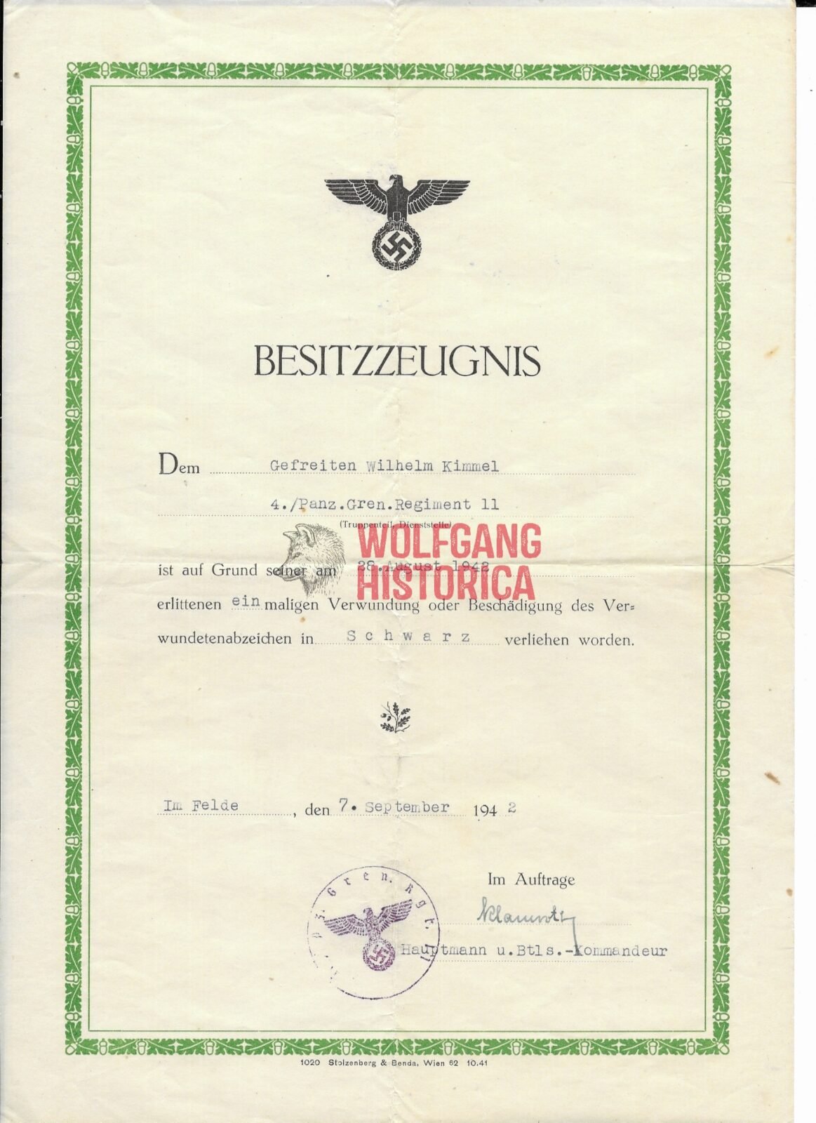 Original Award document (A4) of Gefreiter Wilhelm Kimmel of the 4. Kompanie/ Panzer-Grenadier-Regiment 11 of the 9. Panzer-Division for the Verwundetenabzeichen in Schwarz (Wound Badge in Black) for his wound sustained on August 28, 1942 in the Woronesch area (?) Signed by an unknown officer. Condition as seen.