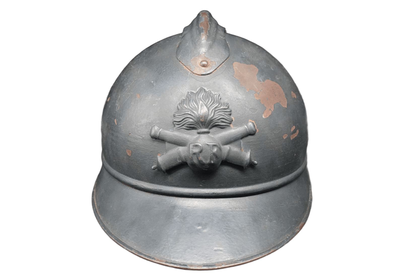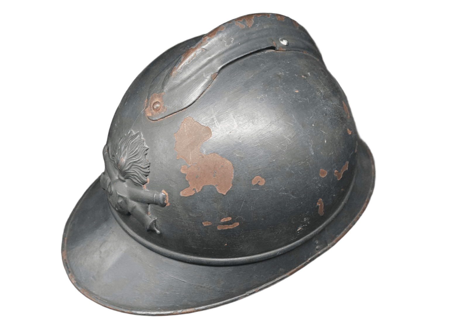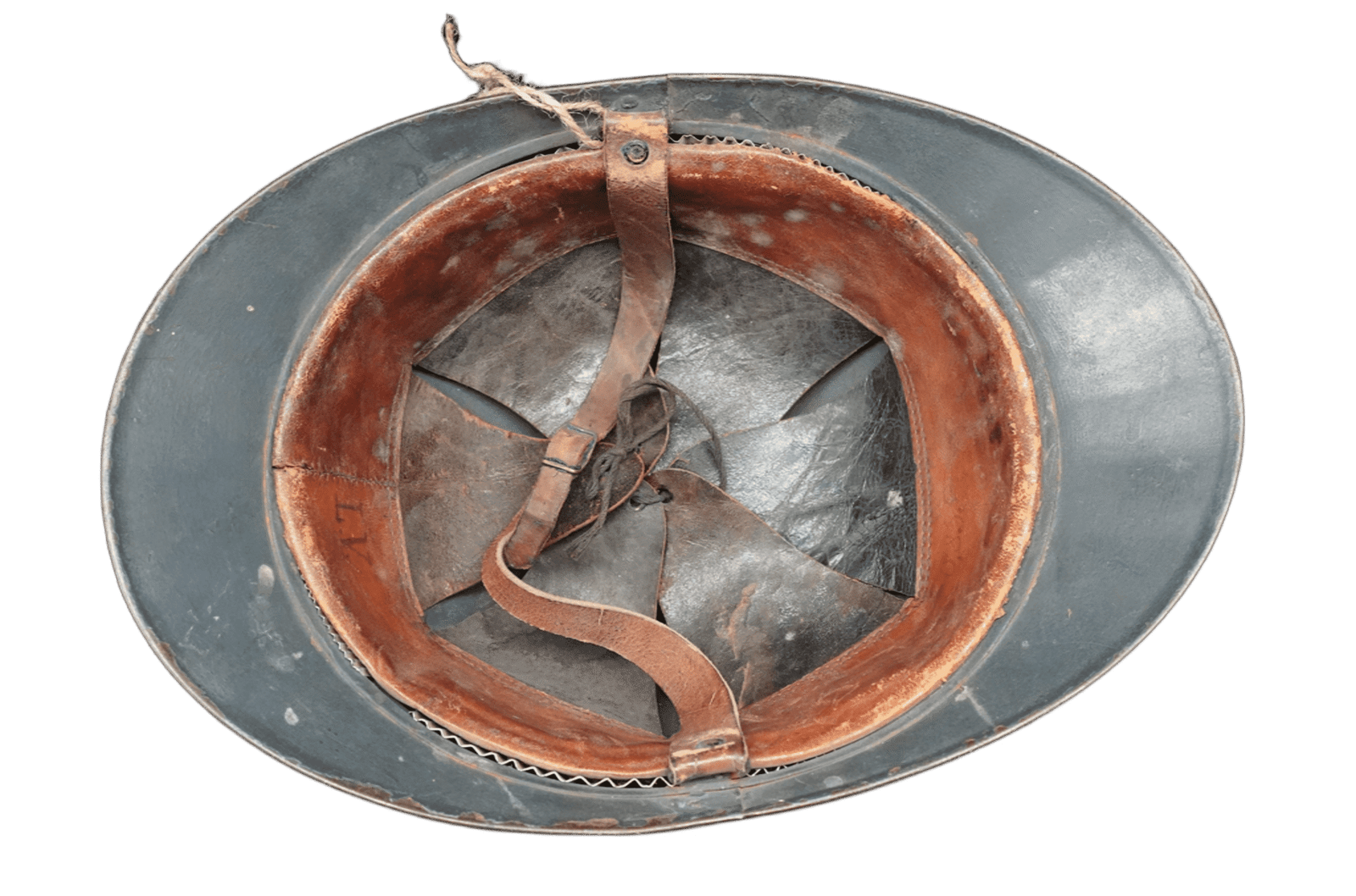 Original French M15 Adrian World War I helmet for Artillery troops. Helmet is “horizon blue” (bleu horizon), inner helmet made with uniform leftovers! Complete with chin strap. Condition as seen.