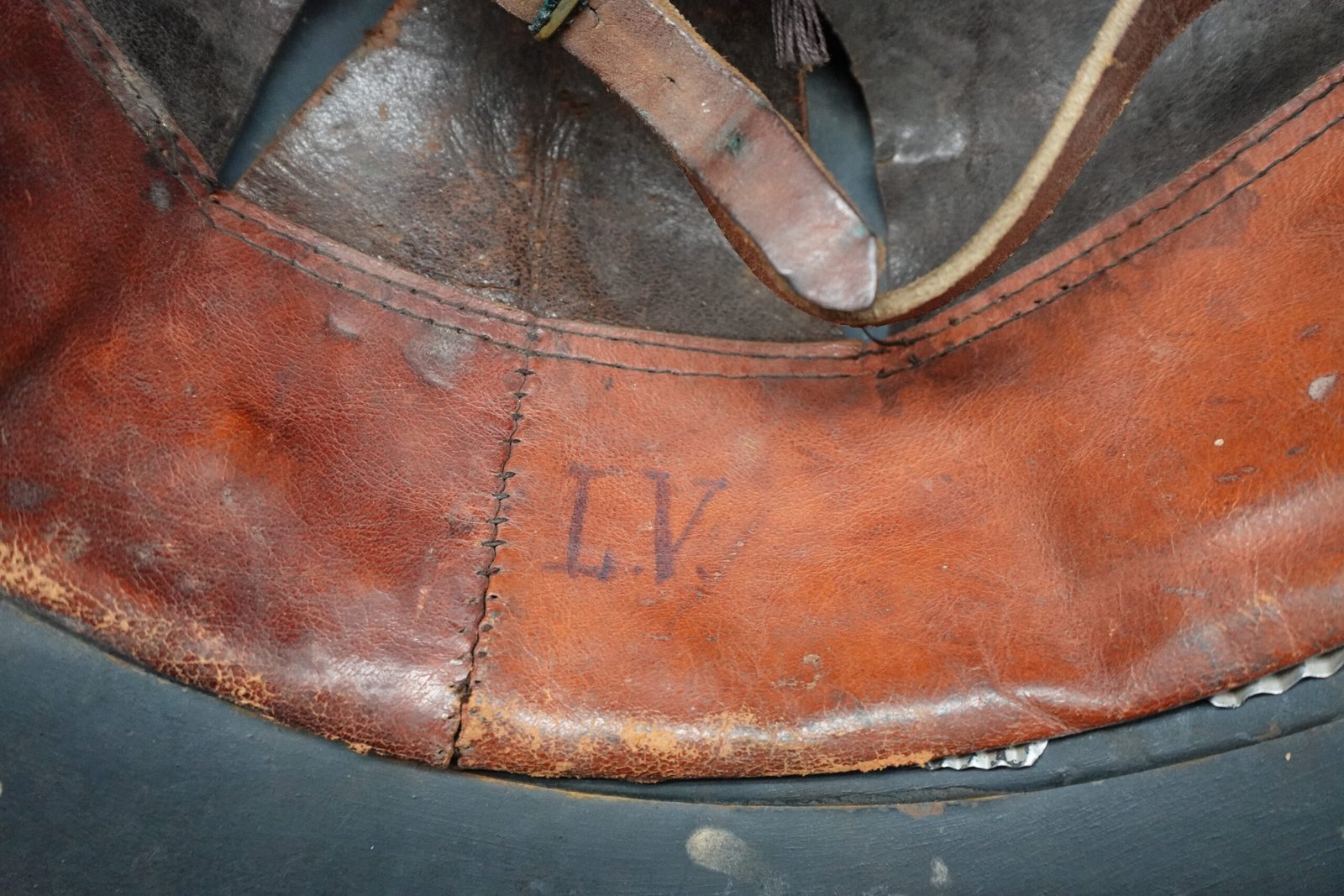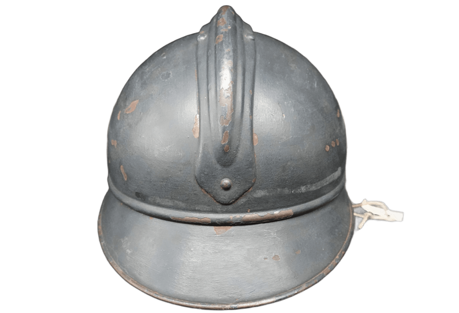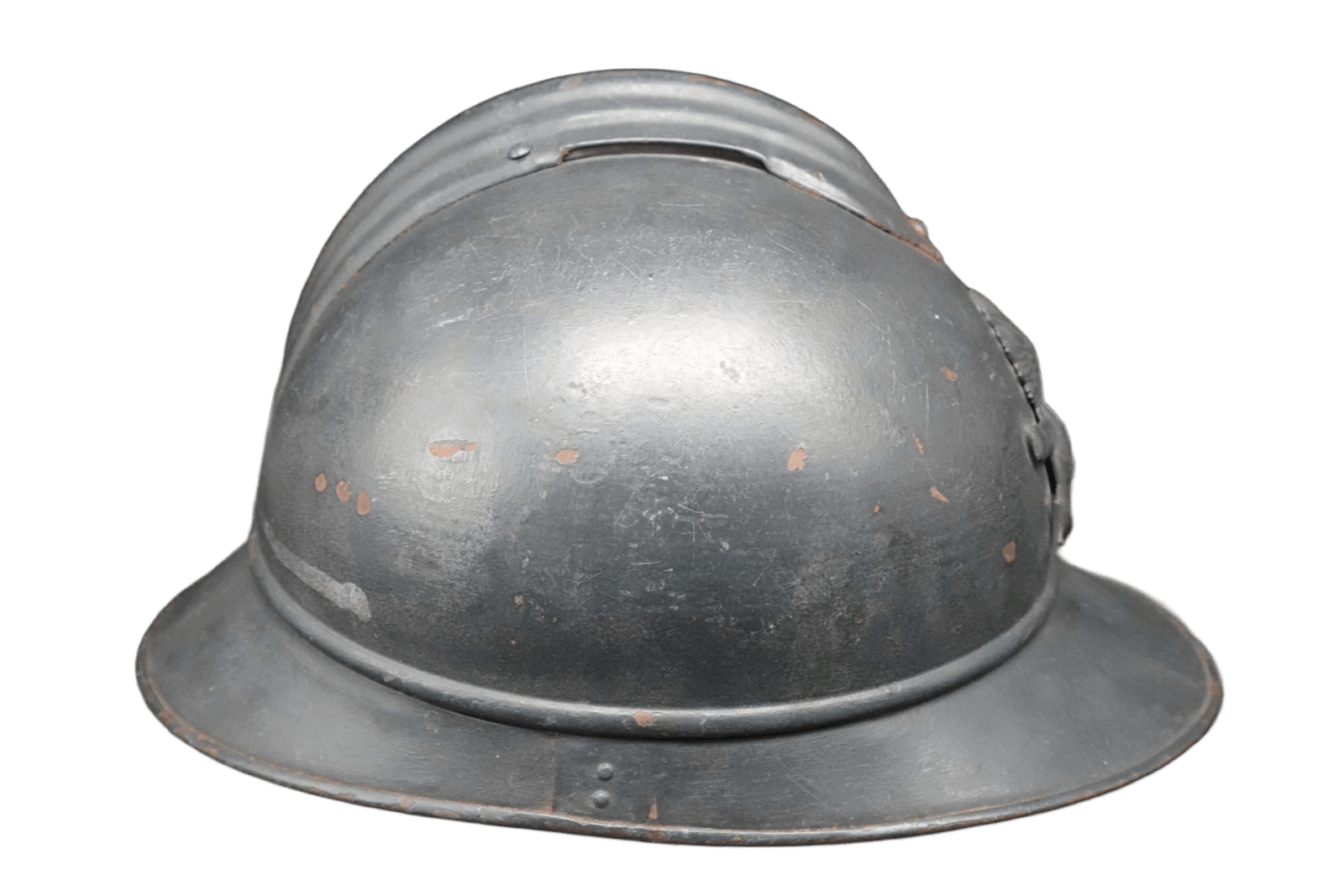 Original French M15 Adrian World War I helmet for Artillery troops. Helmet is “horizon blue” (bleu horizon), inner helmet made with uniform leftovers! Complete with chin strap. Condition as seen.