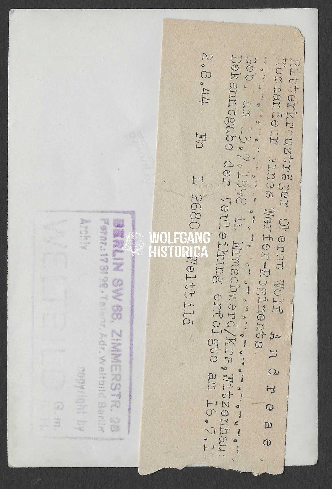 Original Press Photograph of Wolf Andreae. Oberst Wolf Andreae (13.07.1898 † 18.12.1991) earned the Ritterkreuz des Eisernen Kreuzes on June 24, 1944 as Oberst und Kommandeur in the Werfer-Regiment 71 of the Werfer-Brigade 5. Postcardsize. Condition as seen.